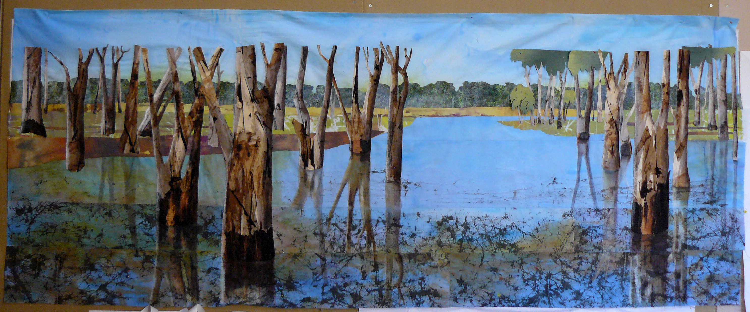 I am currently working on a commission for St. Marys of the Angels Secondary College, Nathalia (where I work part-time). The piece is for a large wall space in a conference room. I decided to use a long horizontal landscape format, showing off the natural bushland around Nathalia, mainly River Red Gums. I have been thinking to do something with trees and water, with reflections etc. for a while. I roughly sketched my idea of the trees in water, (which was approved). I then took some photos and sketched out the drawing in more detail. I then took it to a copy shop to be enlarged.