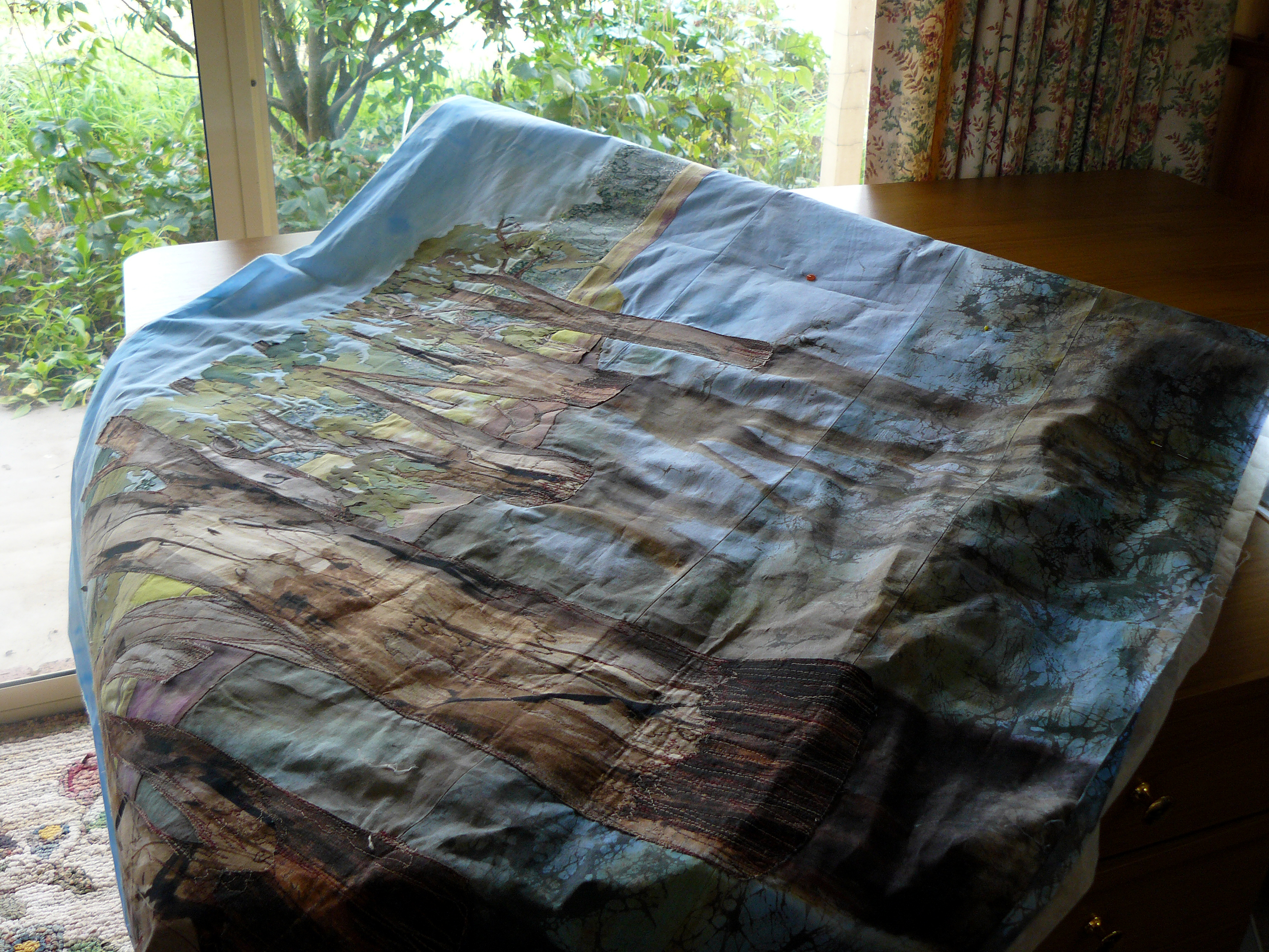 I have been adding leaves, to soften the tree trunks and add perspective. The background is being thread sketched with a selection of variegated threads, which is taking a long time due to the large size.