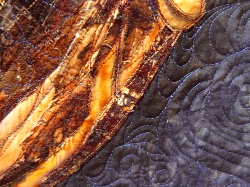 This is a recently completed piece made for Victorian Quilters challenge for 2013 which is currently travelling the country. The rabbit in the front is looking at us as if to say” I’m going over there and you can’t stop me”. I have used tiny pieces of hand cut cotton fabric to build up a collage of the rabbit which were glued down and sewn over. The background is pieced with a mixture of commercial and hand dyed fabric. It was difficult to get the fence right. After some trial and error I ended up free-motion quilting the wire with a darkish grey thread. The crows were added to balance the design.