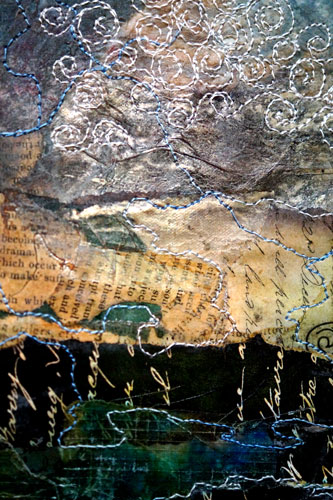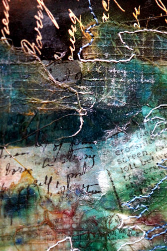 It was my intention to use the actual text in the piece, perhaps as stacked journaling, or typed up in different fonts and sizes. Due to time constraints, I ended up using a random collection of text papers, some actually torn from an old bible.