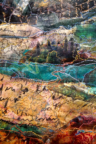 When it was completely dry I added a piece of backing fabric and quilted it with a very sharp jeans needle using cooler colours in the background and warmer colours in the foreground. I tried to get some mystery into the piece by blurring the line between the mountain and the cloud. This was done with a small swirling quilting pattern.