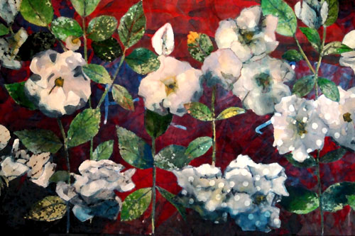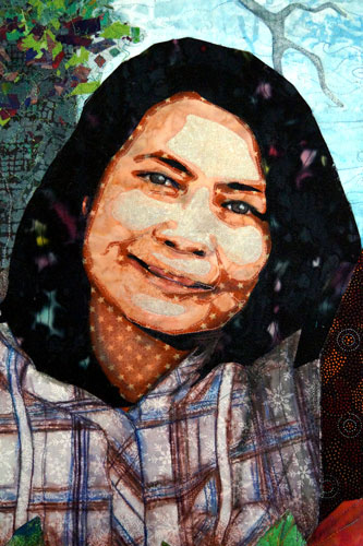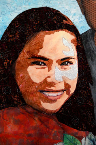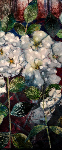 Technique: Handpainted/silk screened wholecloth background. Fused fabric applique for figures and roses. Confetti technique for the tree leaves. I used Inktense pencils to shade the roses and the leaves were printed with compressed sponged, cut out and appliqued.