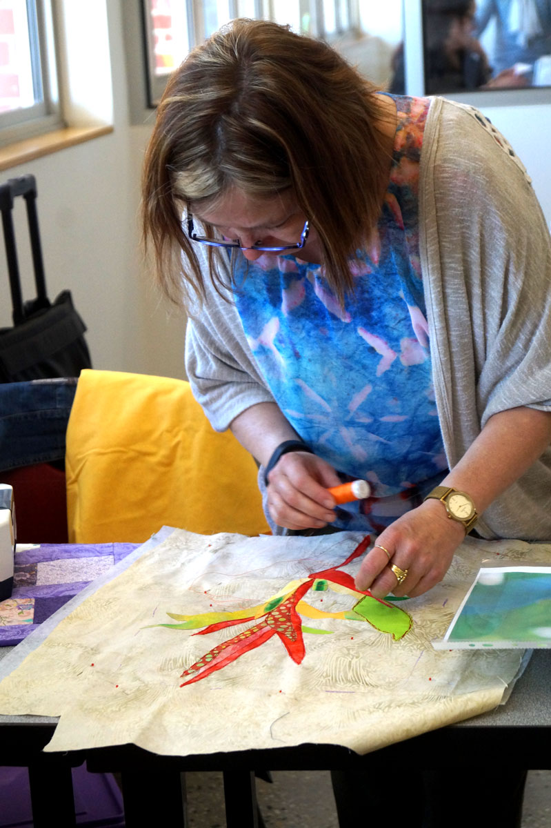 Whole cloth quilt, cotton, raw edge applique, silk organza, fabric paint and stencil, thread sketching and free motion quilting on domestic machine.