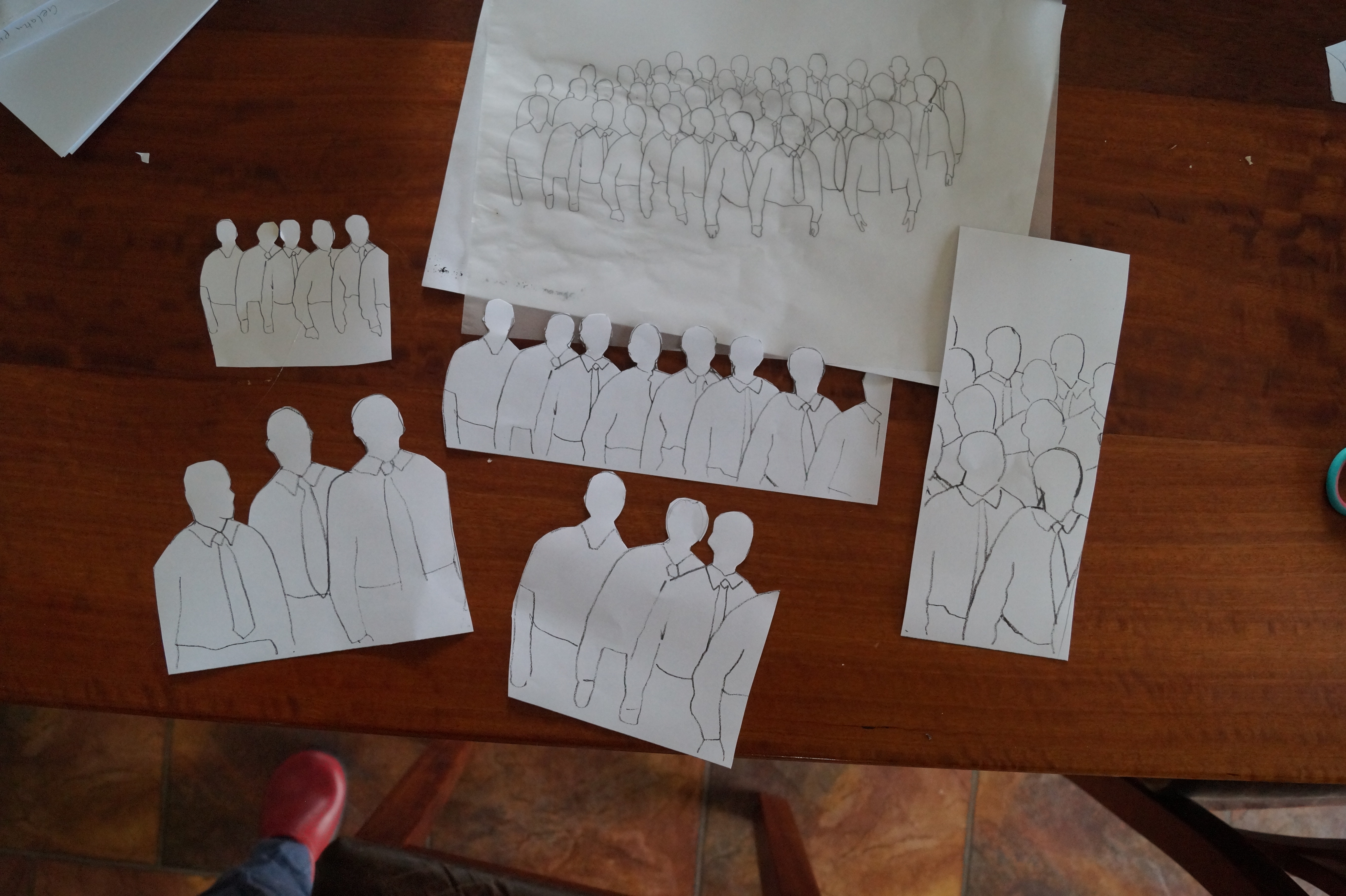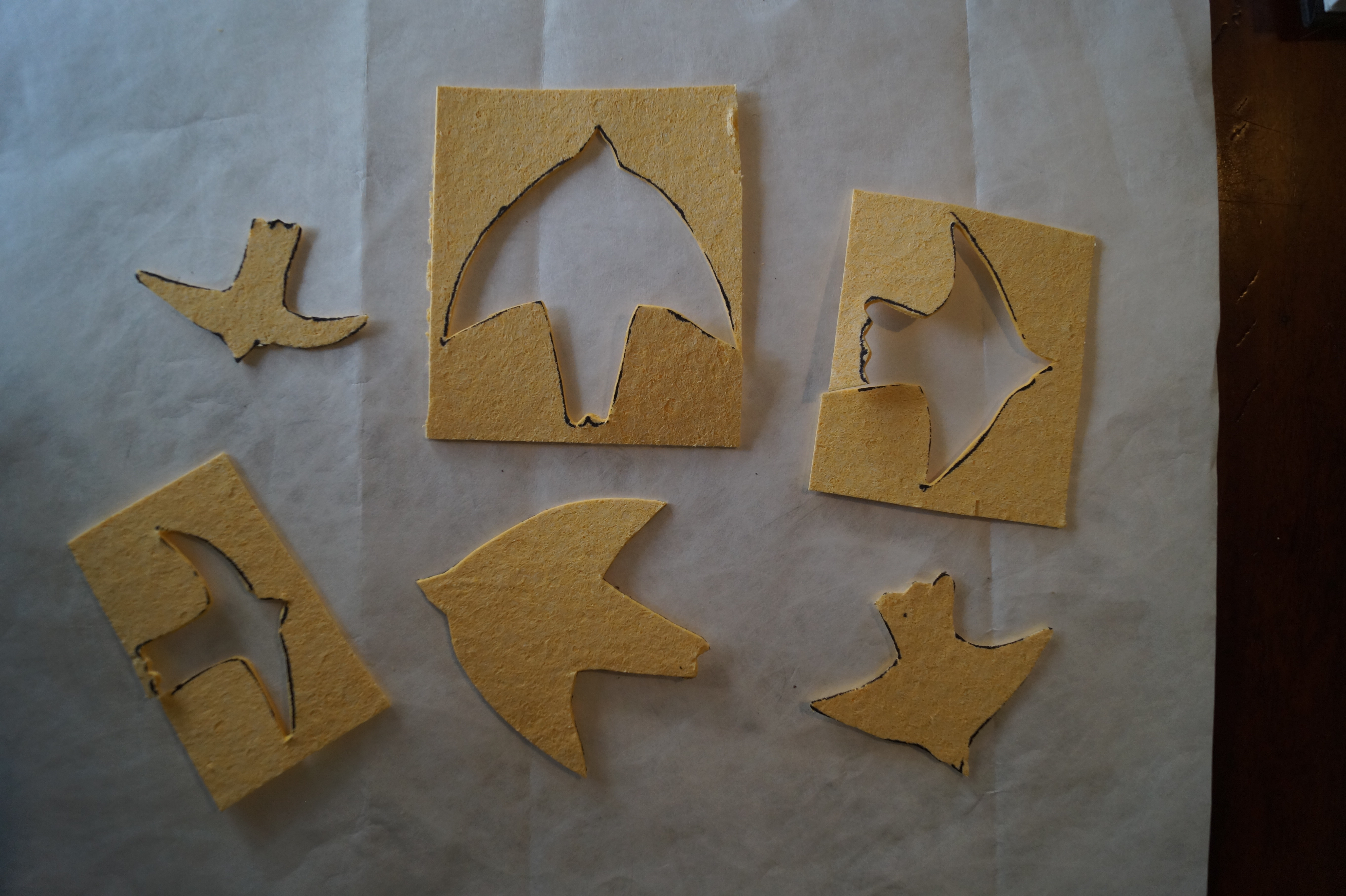 Compressed sponge is wonderful stuff. It is flat when you get it which means you can draw and cut out your design easily. When you put it in water is expands and can be used like a sponge (kids find this fascinating). Stamping with these gives a unique look, although some of the prints can turn out imperfect (which I like). I have cut out some shapes to use as a template. Here I have used the choir people and some birds. Again, I may not use any of this, but it gives me choices.