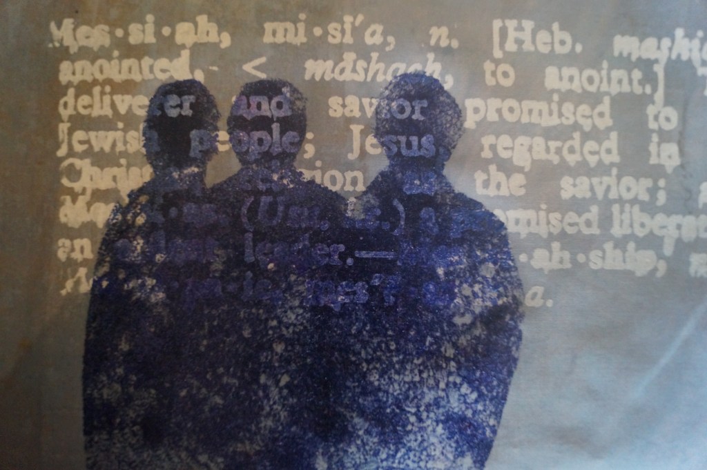 I have also made two thermofax screens. These are low tech printing screens that can achieve very fine lines. One is a piece of music photocopied straight from my Dads copy of Handel’s Messiah (this is quite poignant as he is no longer with us). The song is “The Trumpet Shall Sound”. Viewers of the quilt will probably not realise the significance, but I will! The second one is of the dictionary meaning of the Messiah. People will not be able to clearly read the text, but will hopefully, see glimpses of words like ‘Jesus’, ‘Saviour’ , ‘promised’ when they look closer etc.
