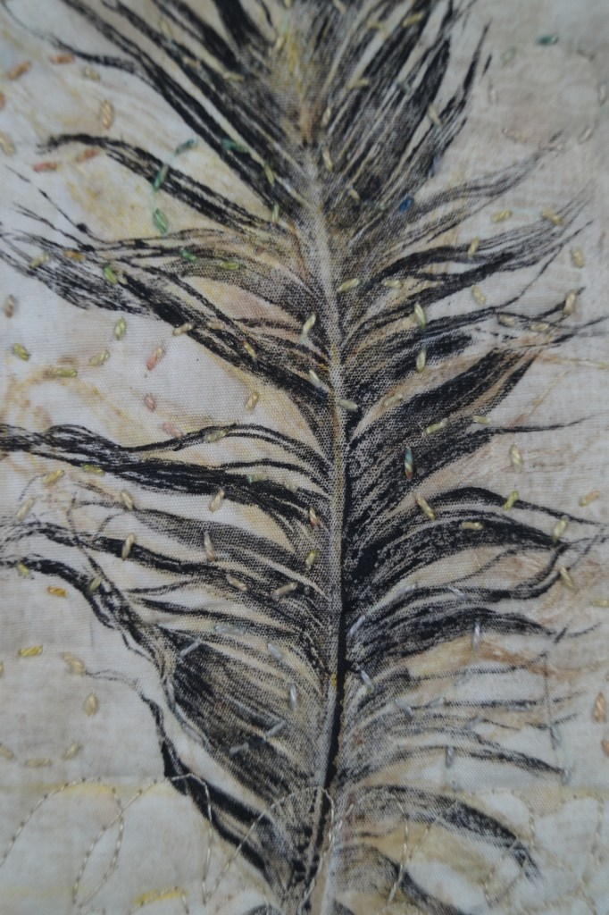 The main process in this piece is mono-printing, using a round geli plate. Feathers were done directly, whilst I used a stencil for the bird shapes. Because this process is quite unpredictable (and more difficult on fabric), only one in four or five work out. I probably did over 100 prints to get the ones shown here!