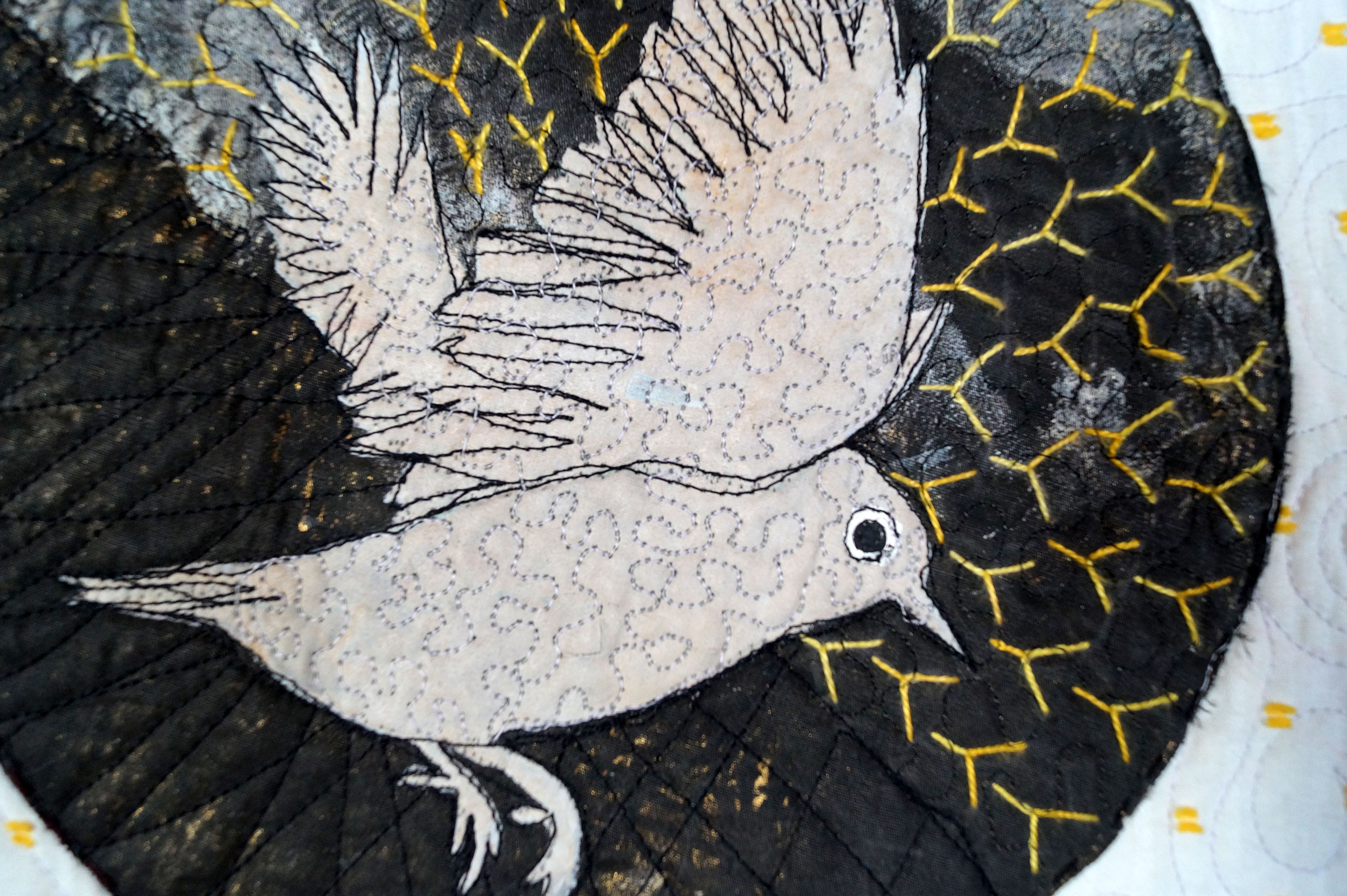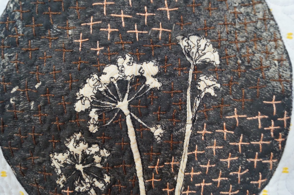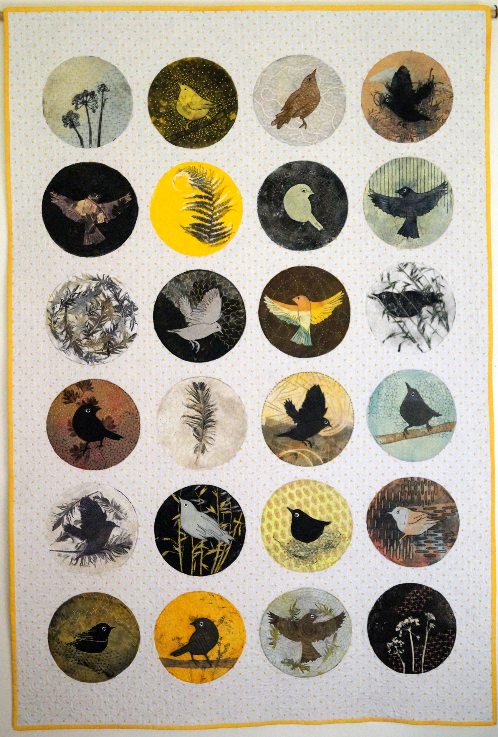 This quilt forms part of my new series of works depicting observations from walks around my property, consisting mostly of birds and wildflowers.