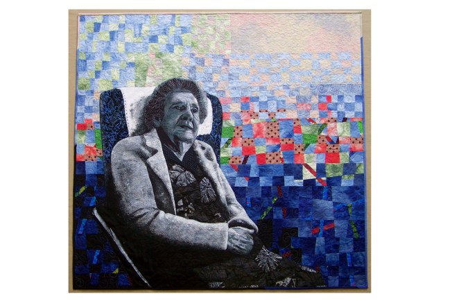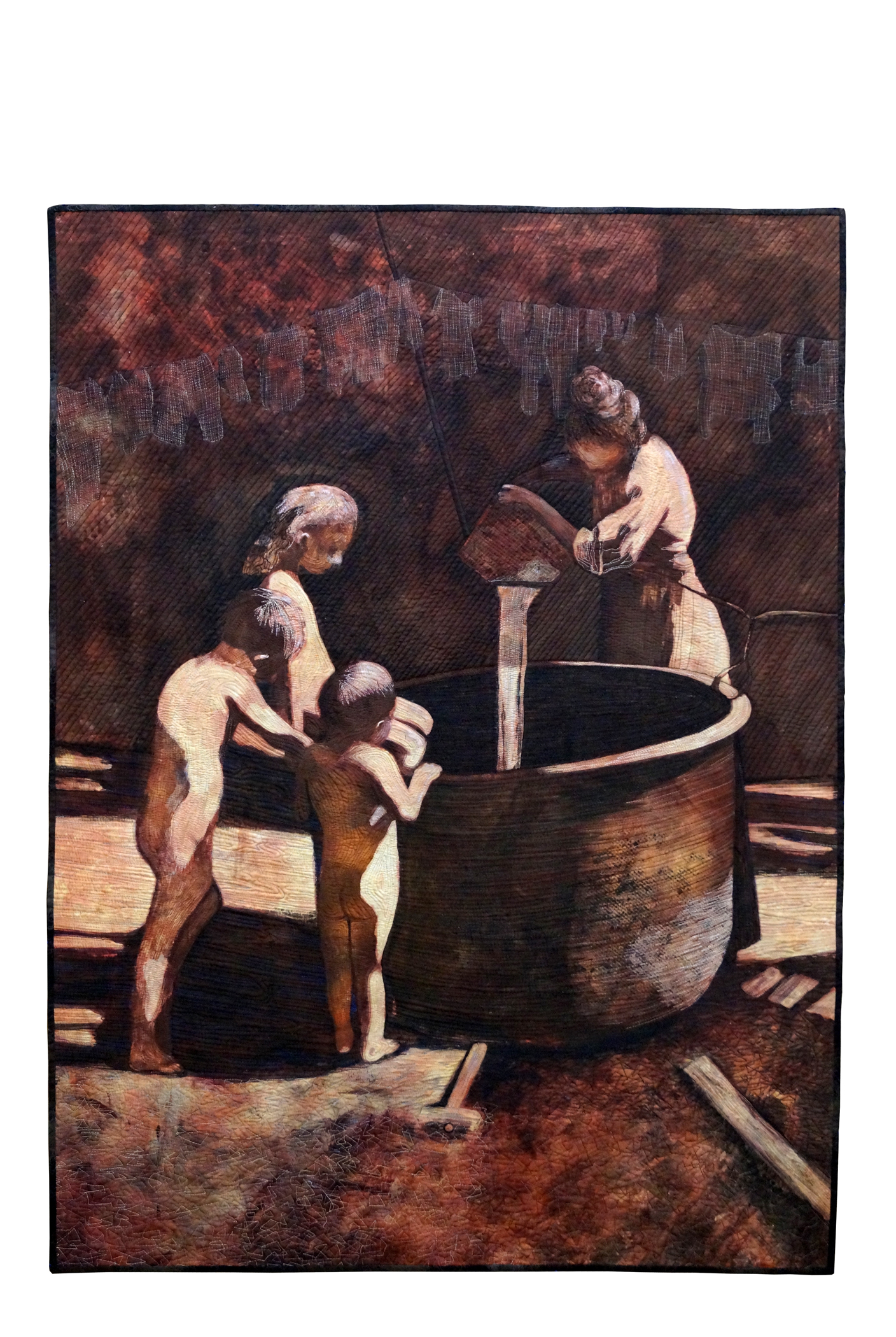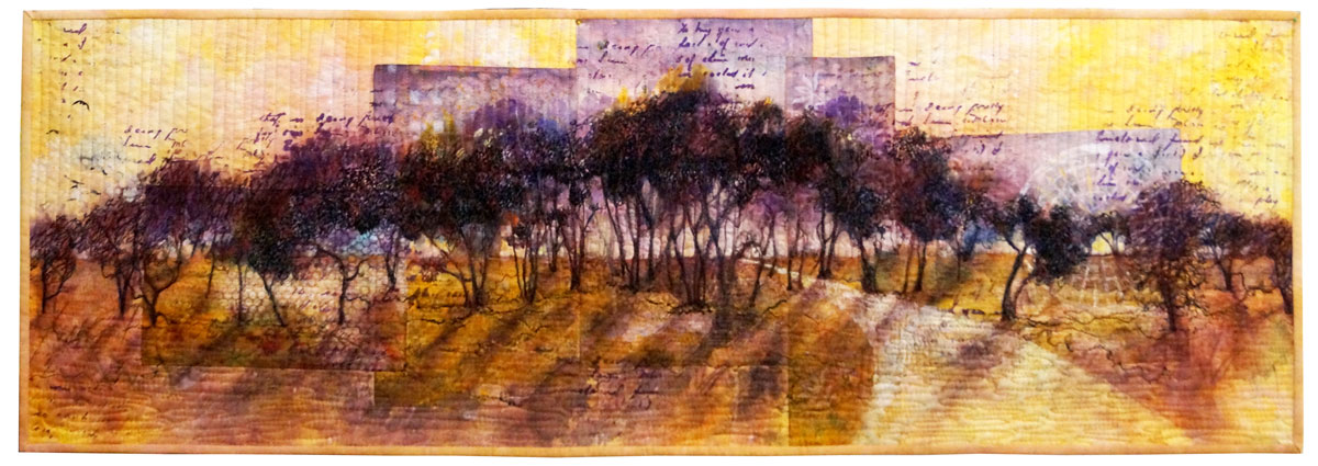 Pieced, painted, collaged, machine thread-sketched and quilted.